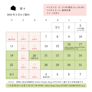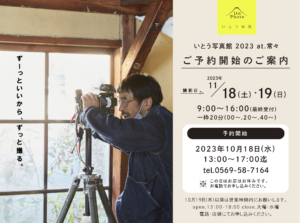 2023-2024 年末年始営業のお知らせ 2023 12/20 未分類 2023 2024 NEWS TOPIC いとう写真館 ご予約開始 2024年3月の予定 関連記事 2026年1月のご案内 2026年1月6日 2025年もありがとうございました。 2025年12月31日 海を感じる時 外山辰郎 2025年12月24日 TOKONAME HUB TALK vol.18開催のご案内 2025年10月21日 いとう写真館2025ご予約開始のご案内 2025年10月21日 10月後半〜11月前半のスケジュール 2025年10月21日 「雲と泥と」形而上の庭 “Cloud and Mud and”metaphysical garden 2025年10月8日 10月のカレンダー 2025年10月8日