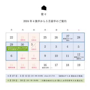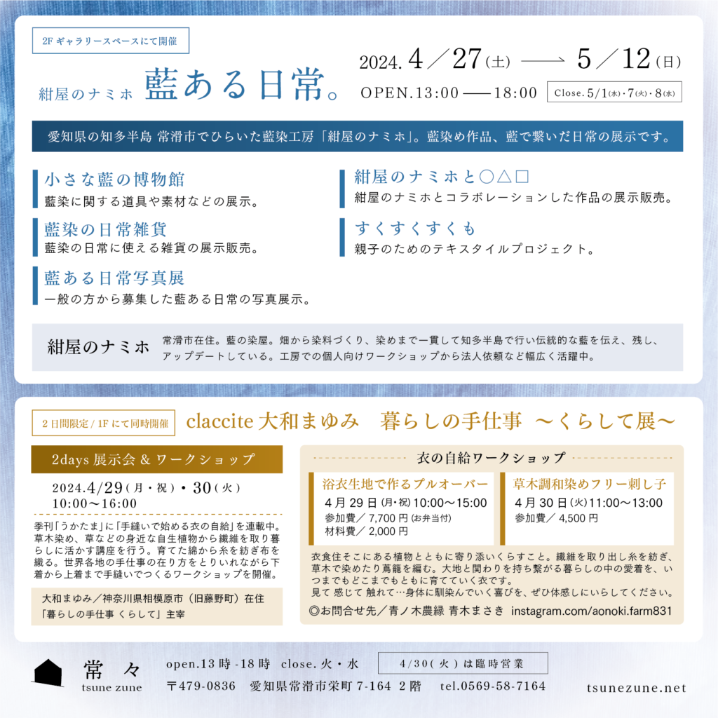 紺屋のナミホ 藍ある日常。展 2024 4/07 常滑に藍染工房をひらく「紺屋のナミホ」さんの展覧会のご案内です。 日々、地域と密接に関わりながら土地に根差した活動を広げているナミホさんの 作品や、日常の写真などの見て触って、感じる展示会です。 G.W.の暖かい頃、ぜひご予定ください。 未分類 2024 NEWS TOPIC 2024年4月後半から5月前半のご案内 2024年4月後半ー5月前半 営業日訂正のご案内 関連記事 2026年1月のご案内 2026年1月6日 2025年もありがとうございました。 2025年12月31日 海を感じる時 外山辰郎 2025年12月24日 TOKONAME HUB TALK vol.18開催のご案内 2025年10月21日 いとう写真館2025ご予約開始のご案内 2025年10月21日 10月後半〜11月前半のスケジュール 2025年10月21日 「雲と泥と」形而上の庭 “Cloud and Mud and”metaphysical garden 2025年10月8日 10月のカレンダー 2025年10月8日
