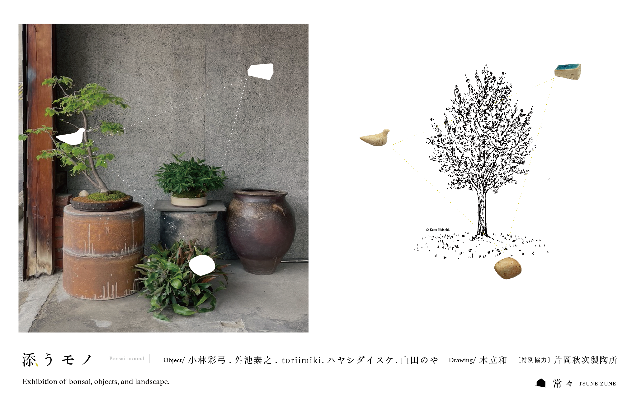 盆栽を飾る作法の一つ「添配/TENPAI」に着目し、「植物/盆栽に添うモノ」をイメージしたオブジェクトと絵のグループ展です。