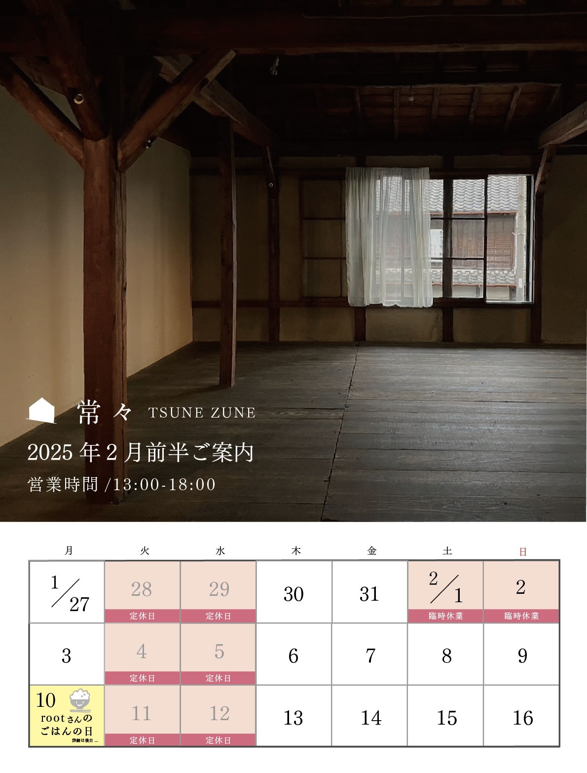 2025年2月の予定 2025 1/27 ◎2月1−2日 臨時休業 ◎2月10日 rootさんのご飯の日 2月もどうぞよろしくお願いします。 未分類 NEWS TOPIC 2025年1月後半の予定 Shita Nomu Soup SUTUDIO EXHIBITION 2025 関連記事 2026年1月のご案内 2026年1月6日 2025年もありがとうございました。 2025年12月31日 海を感じる時 外山辰郎 2025年12月24日 TOKONAME HUB TALK vol.18開催のご案内 2025年10月21日 いとう写真館2025ご予約開始のご案内 2025年10月21日 10月後半〜11月前半のスケジュール 2025年10月21日 「雲と泥と」形而上の庭 “Cloud and Mud and”metaphysical garden 2025年10月8日 10月のカレンダー 2025年10月8日