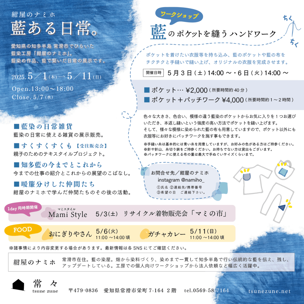 藍染の日常に使える雑貨の展示販売。