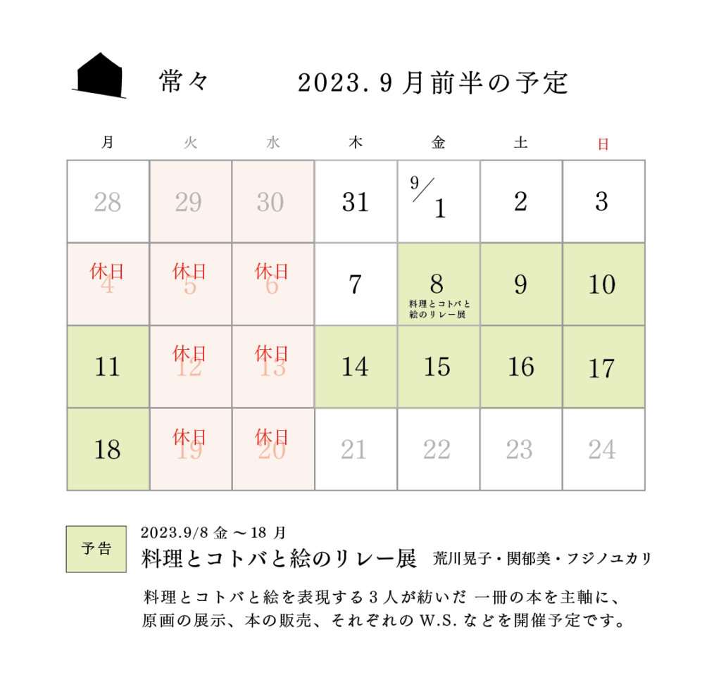 涼風至 2023.8/4-10 ◎よはく舎 / かき氷企画(8/4-6 の三日間限定!) ◎旅と日常 eeyo / アクセサリー展示販売 ◎塩船 / 塩の販売 W.S.(8/6日限定!) ◎言葉と風景 / 新美南吉の言葉と風景 青桃製陶所さんの器お披露目!!のスペシャル企画になりました!... -