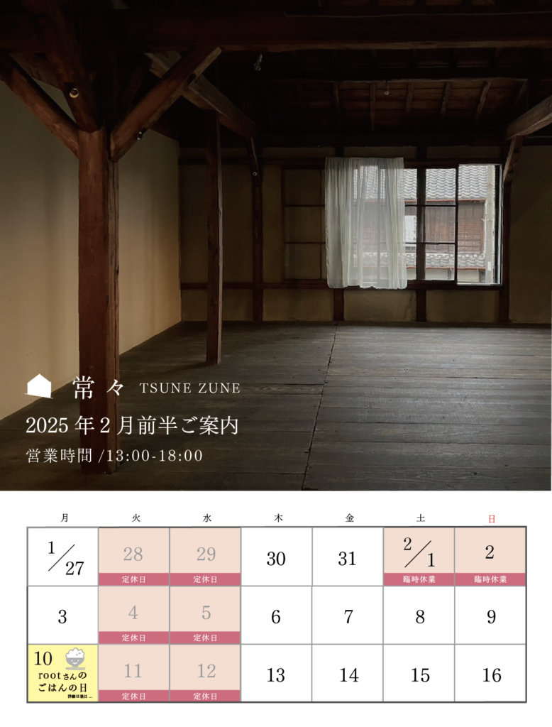 ◎2月1−2日 臨時休業 ◎2月10日 rootさんのご飯の日 2月もどうぞよろしくお願いします。